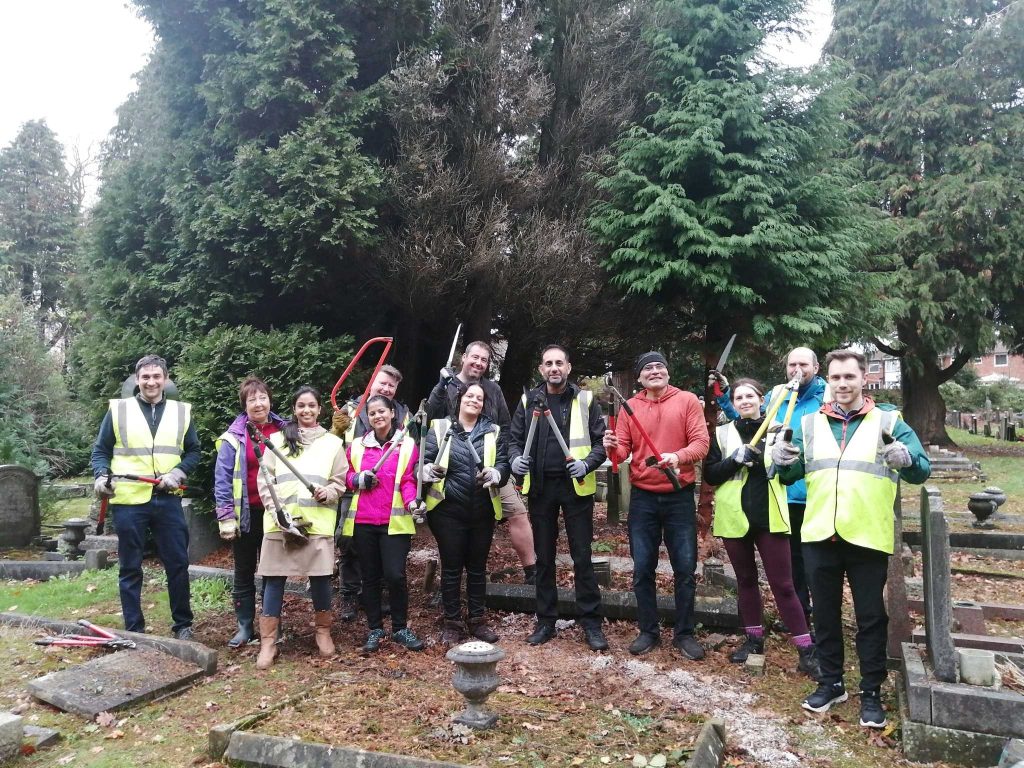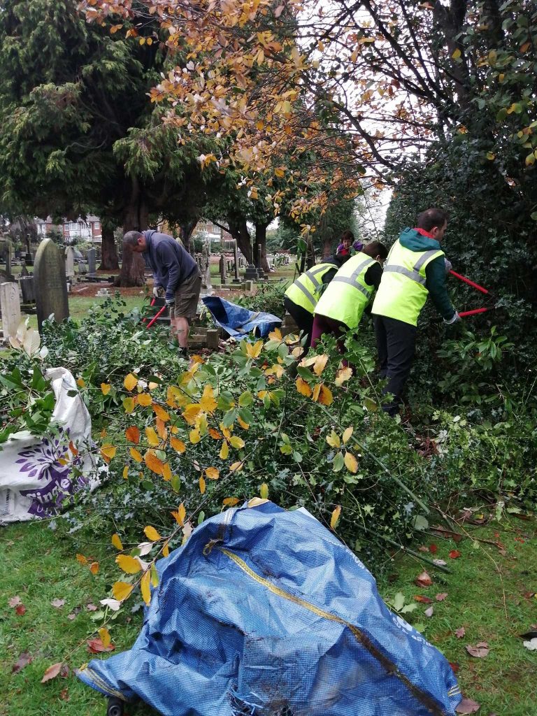 Twelve Deutsche Bank staff and four FBEC volunteers worked all day to clear several large areas of established self set trees and shrubs on one of the sections in the cemetery. It’s a slow process but we are making headway in the cemetery. It is a little like the Forth Road Bridge as we are sure it grows back almost as fast as we remove it, however much of the shrubbery removed has been in place for many, many years and will only return as ”low level.