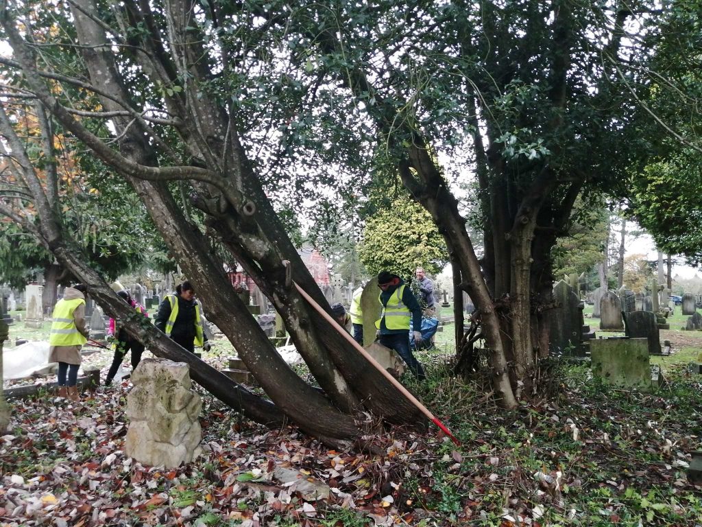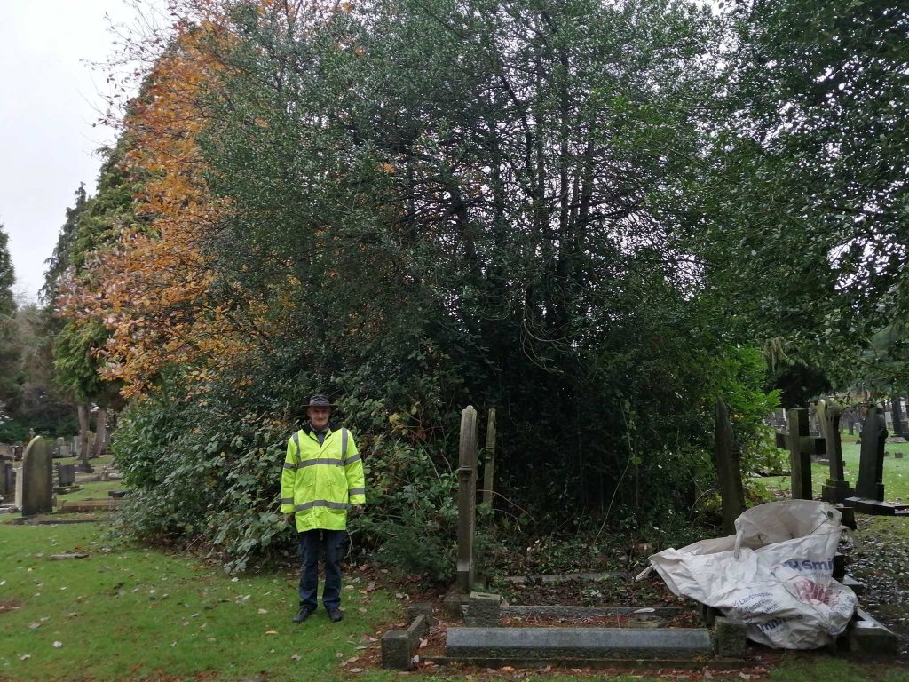 The larger trees are left as the aim is purely to make access to all graves possible. Often the lower branches may be removed if the tree is well established. Below you can see the area above after clearance.